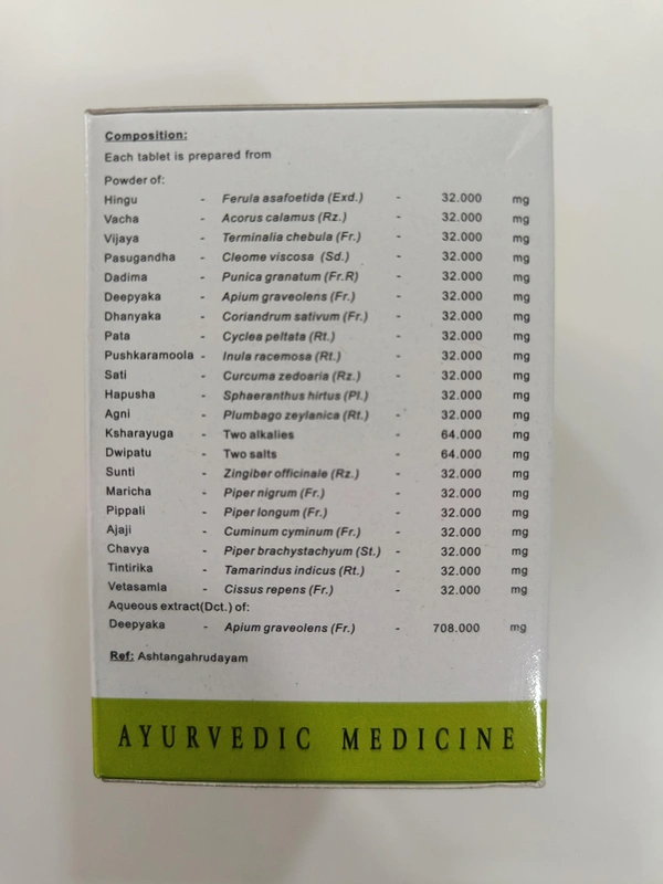Hinguvacha DS tablet contain various herbal products like Hindu Vachan Vijaya marich Pipli which helps in digestion process.