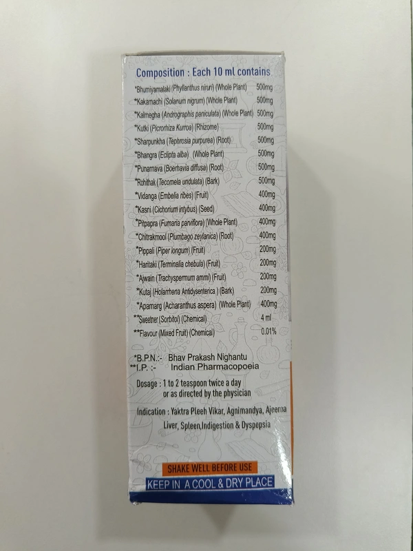This syrup mainly contains Bhumiamalki kakmachi kalmegh kutki punnarva vidang Pipli chitramool.